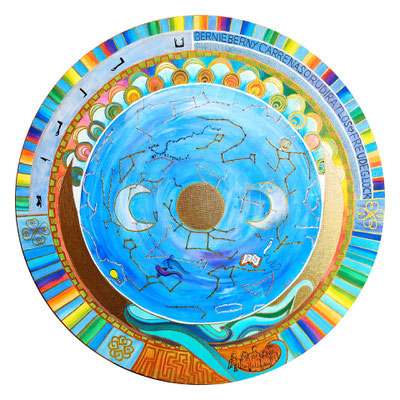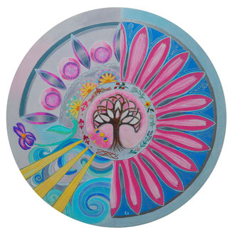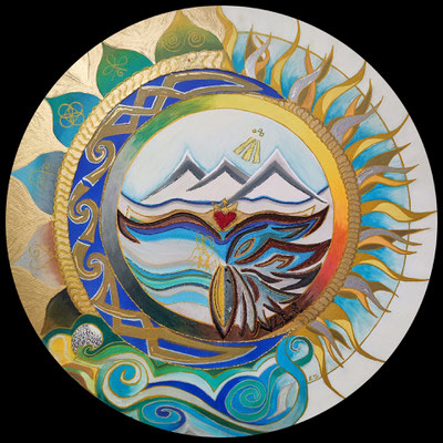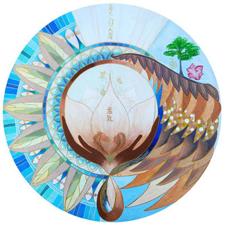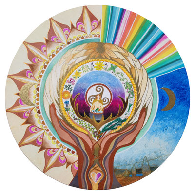 In der Mitte befinden sich tragenden, haltenden, heilenden Hände, die die Lotusblüte halten, eine Frau und ein Pferd – stellvertretend für Menschen und Tiere.