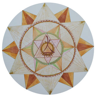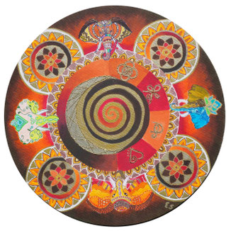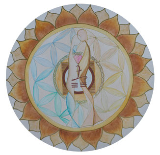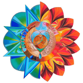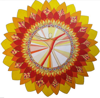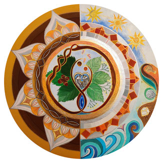 Rechts die weibliche Seite: in rot/gelb-Tönen, außen wie eine Blüte einer Blume. Die geschwungenen feurigen Linien und Flächen stehen für das weibliche Feuer, den weiblichen Schwung, den Tanz, die weibliche Blüte.