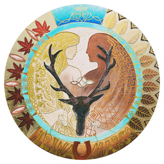Ich habe im inneren Kreis des Bildes im Mittelpunkt die zwei Füchse gesetzt, in einem Herz, dass für eure Liebe steht.