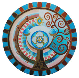 Dahinter ist eine Spirale, die gegen den Uhrzeigersinn geht – sie zeigt den Lebensweg an. Den Weg der Seele im Diesseits, die Seele entwickelt sich auf dem Weg weiter und wächst.