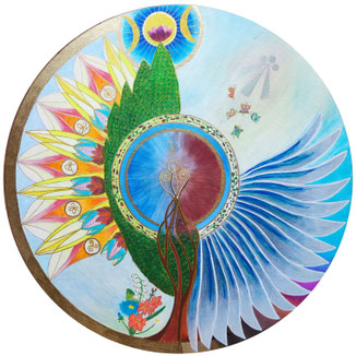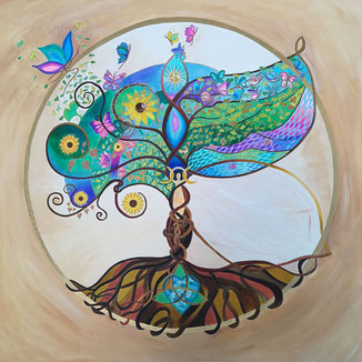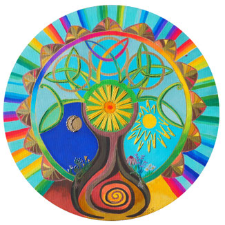 Im Mittelpunkt steht die Urmutter, sie wächst aus den Ästen der Zypresse. Sie strahlt Kraft aus und symbolisiert das Leben selbst.