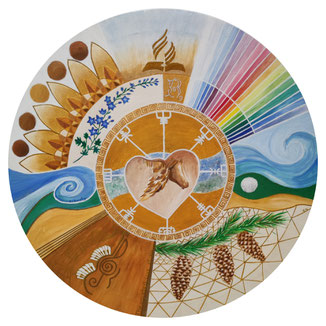 Um die Spirale ist das Feuerrad: die Flammen stehen für den Atem des Lebens, für Inspiration, das Göttliche, für die Erleuchtung, es gibt Freudenfeuer, Feuertänze und das Feuer steht auch für die Liebe.